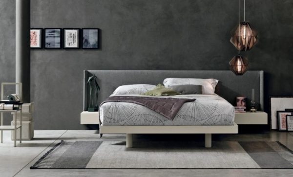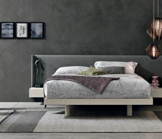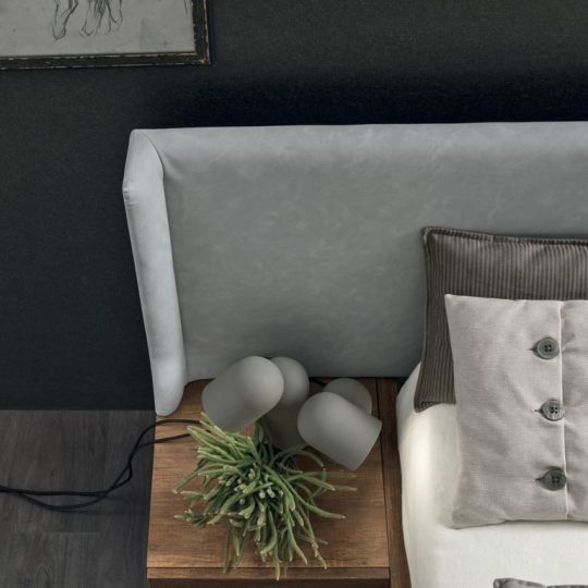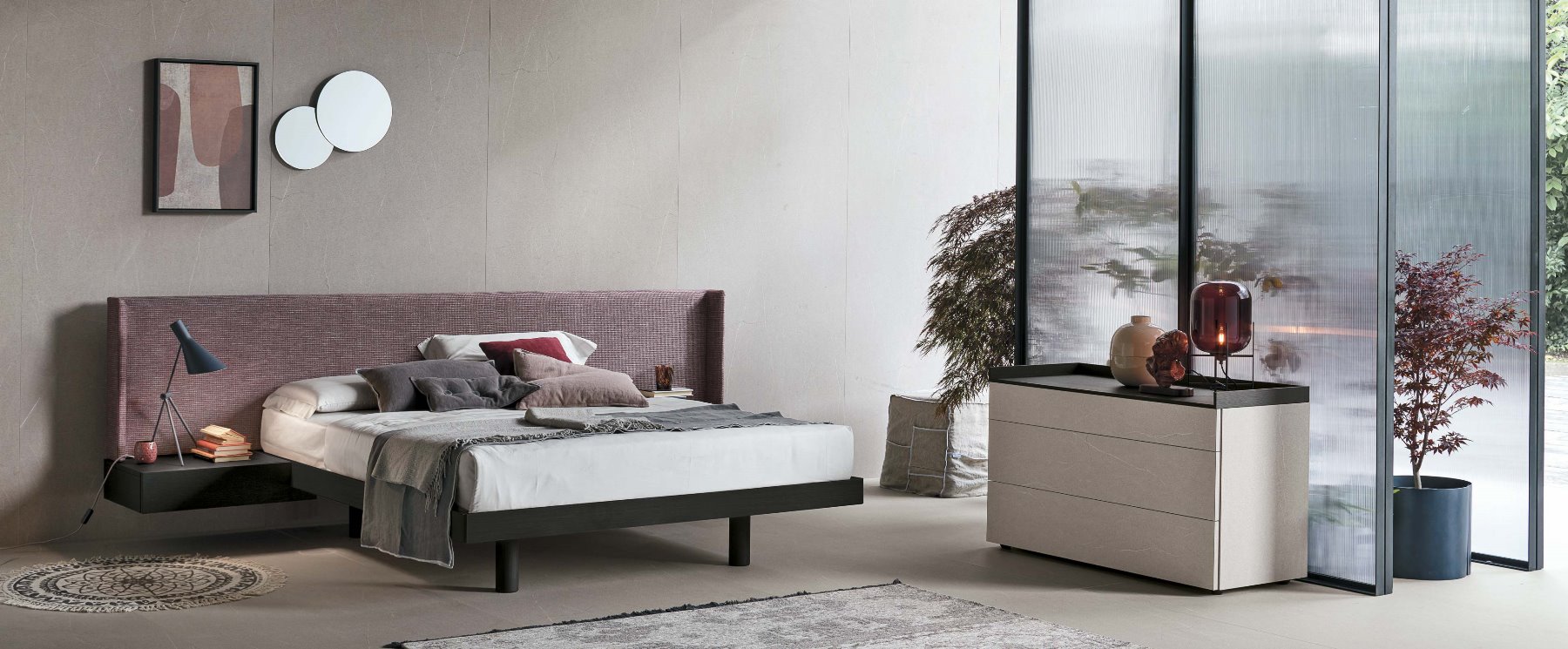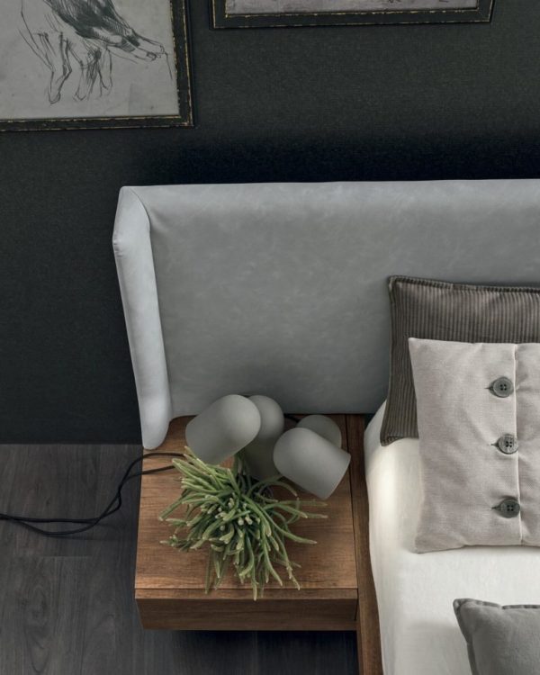 Il letto Fusion è, di nome e di fatto, una totale fusione di elementi: testiera, giroletto e comodino formano un tutt’uno di grande presenza scenica.