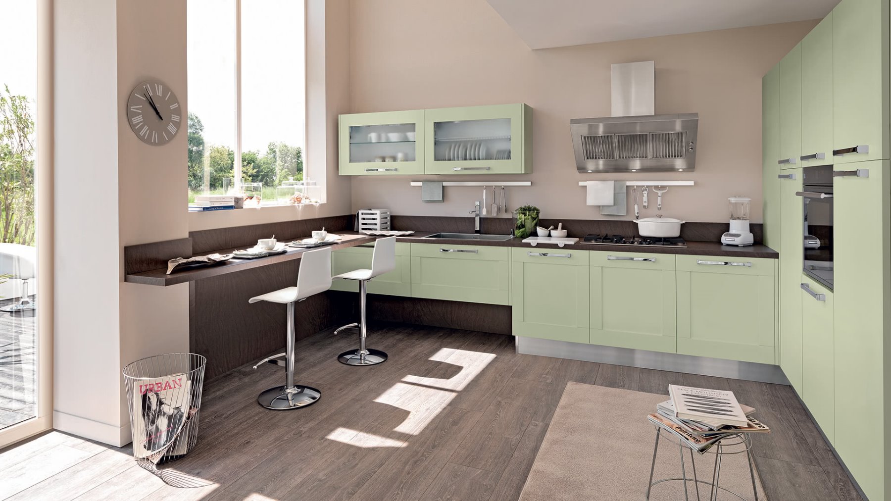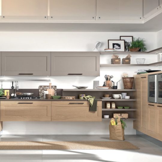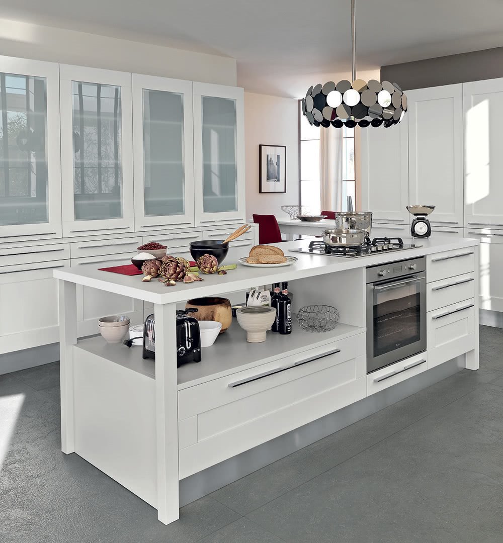 Una cucina con anta a telaio caratterizzata da un design moderno, che può essere interpretata in una unione perfetta di suggestioni romantiche e tratti minimali.Una rivisitazione moderna di tradizioni antiche per l’anta con la maniglia integrata e la presa stondata,